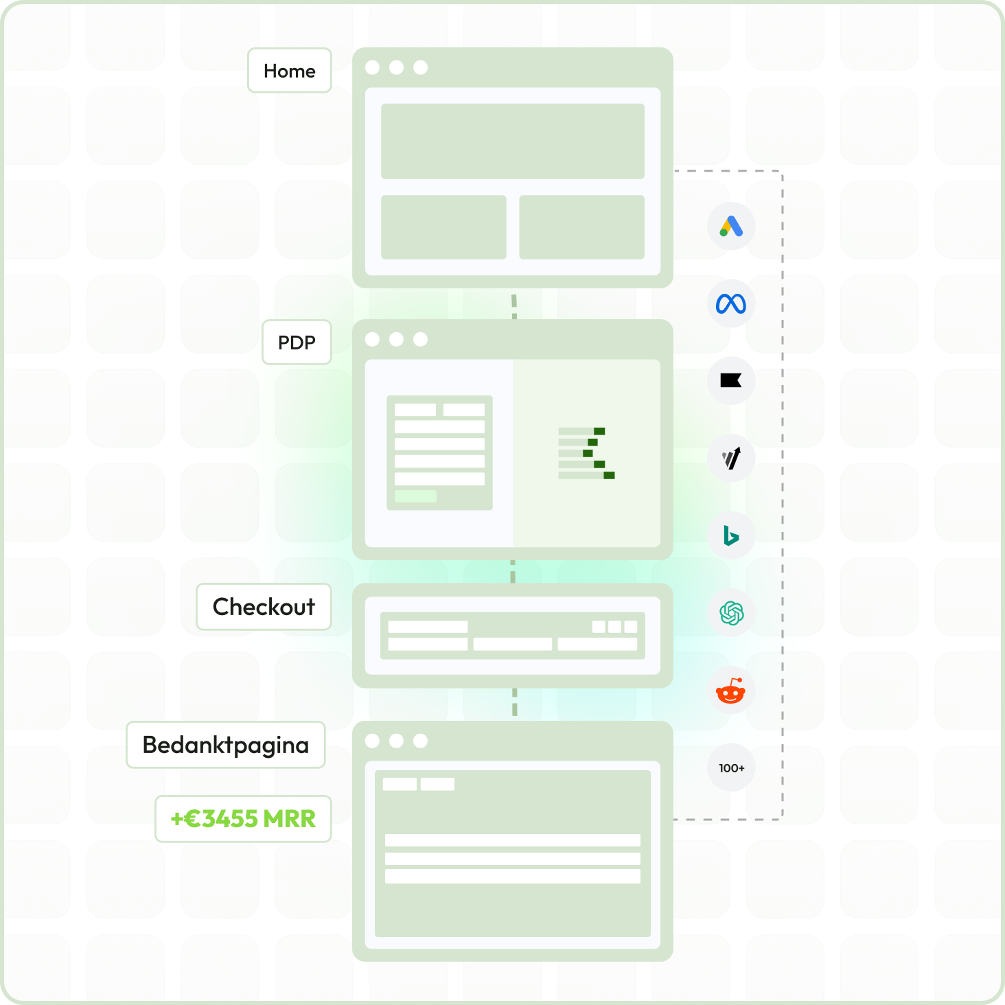 - Experimentatie op kanaal, funnel en creative-niveau met focus op de optimalisatie van de meest kritische metrics